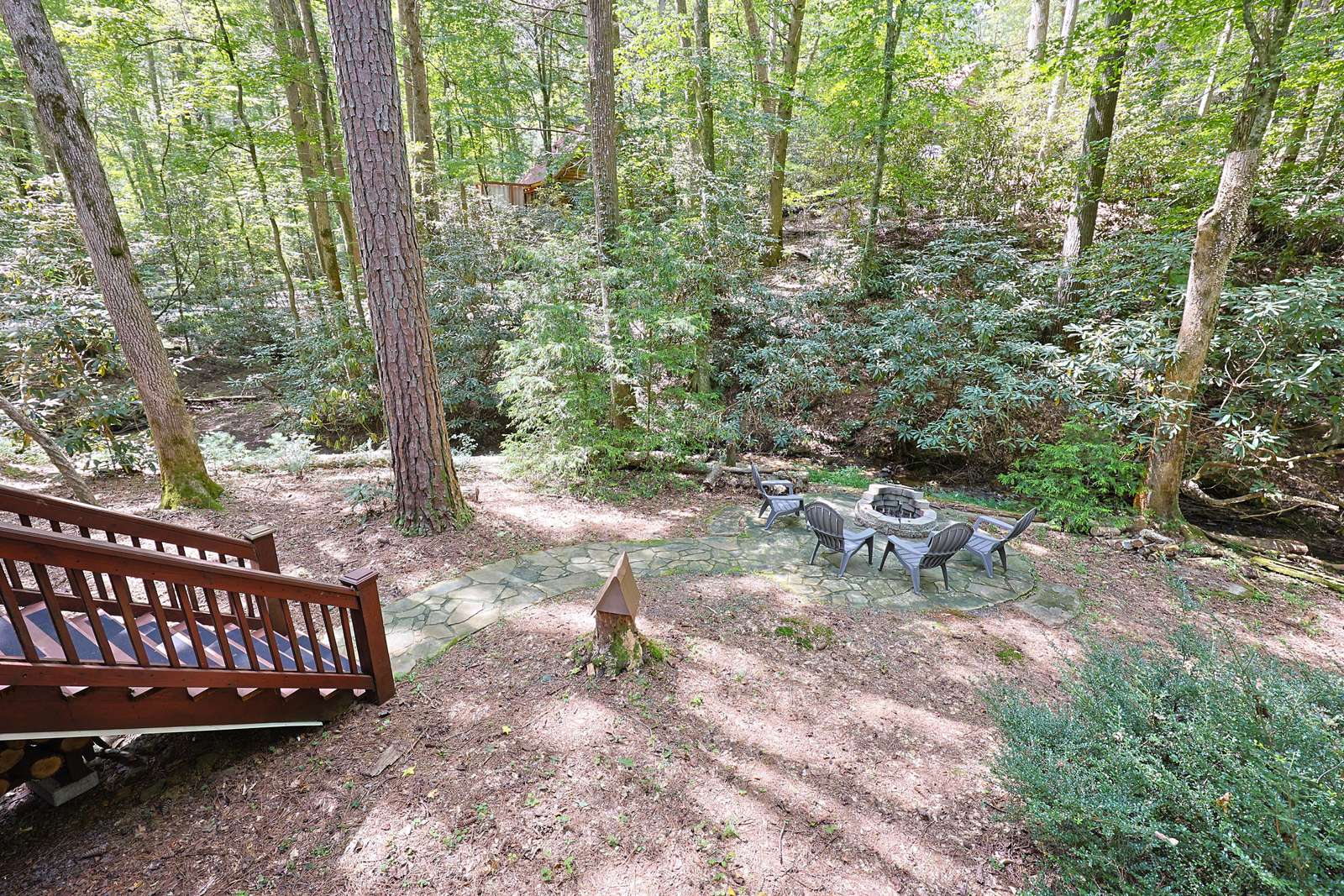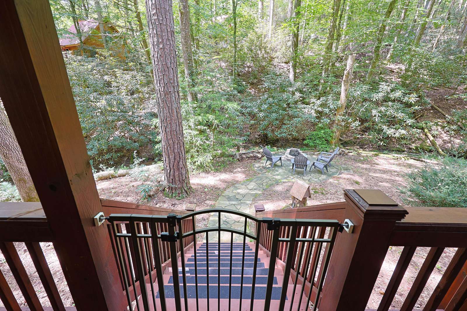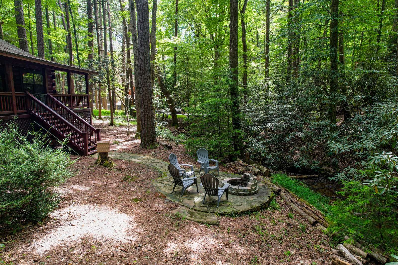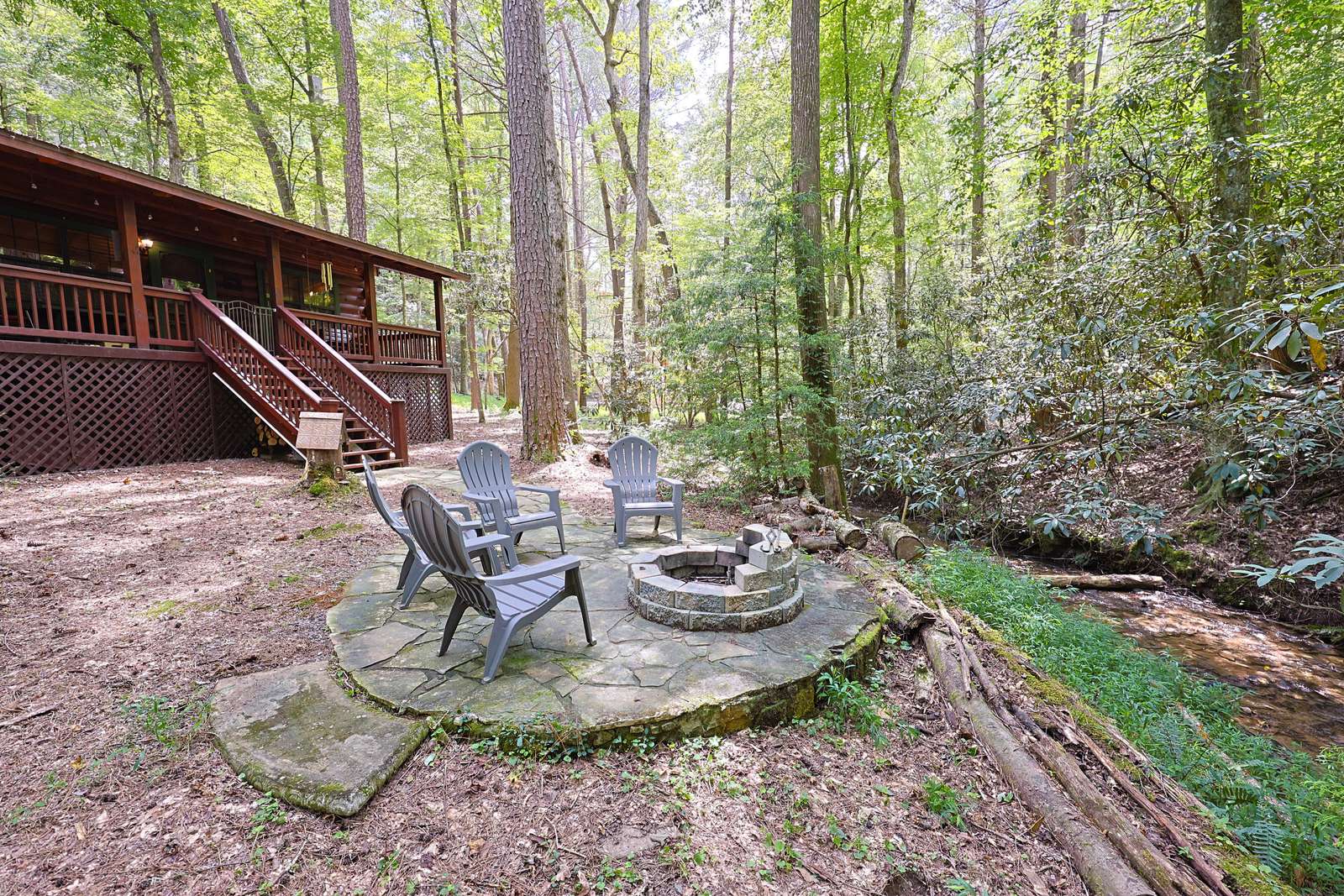 *Stairs - there are two steps leading to front door cabin. Inside cabin is all on one level. Outside decks are all on one level. There are stairs leading to backyard, firepit and creek*
