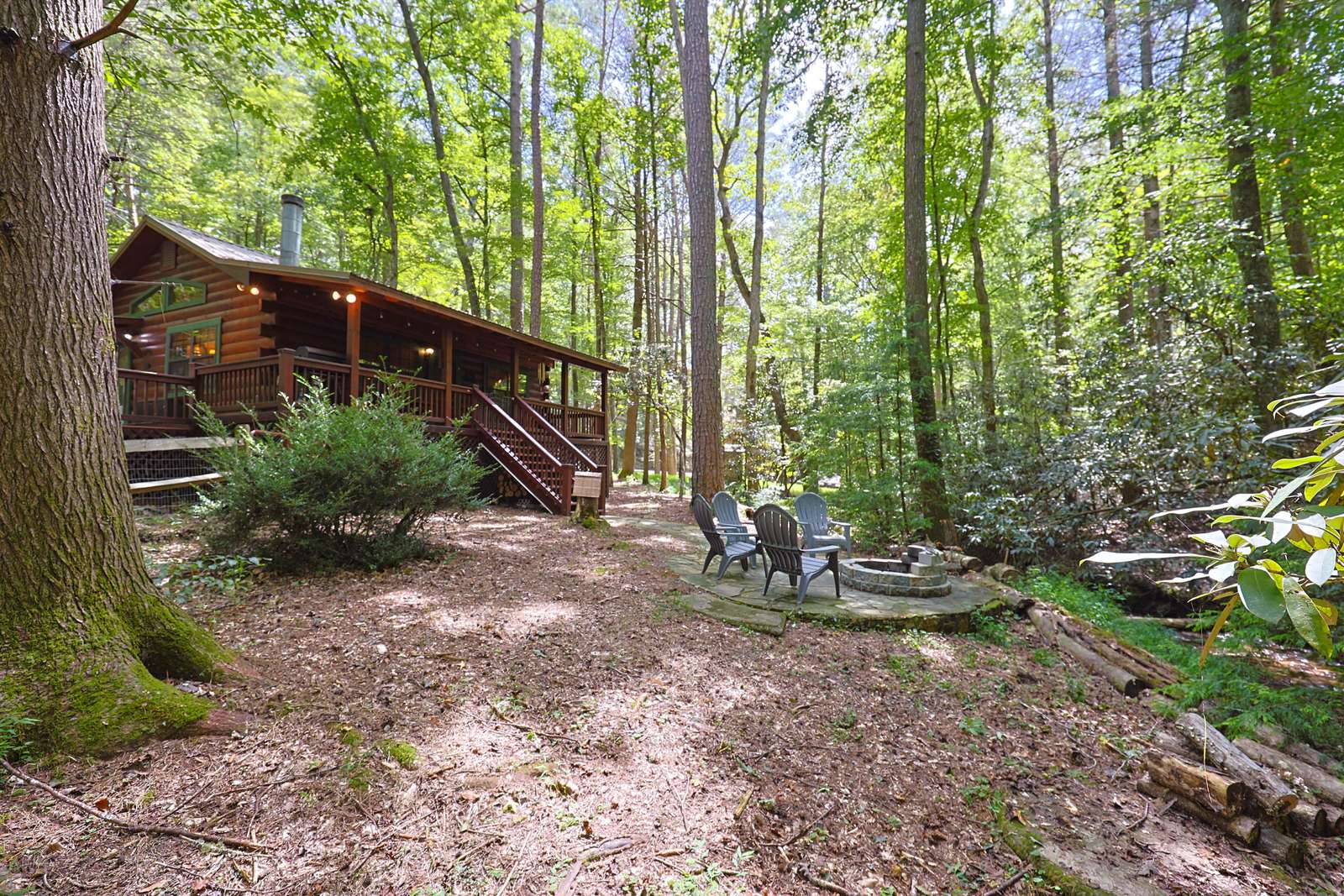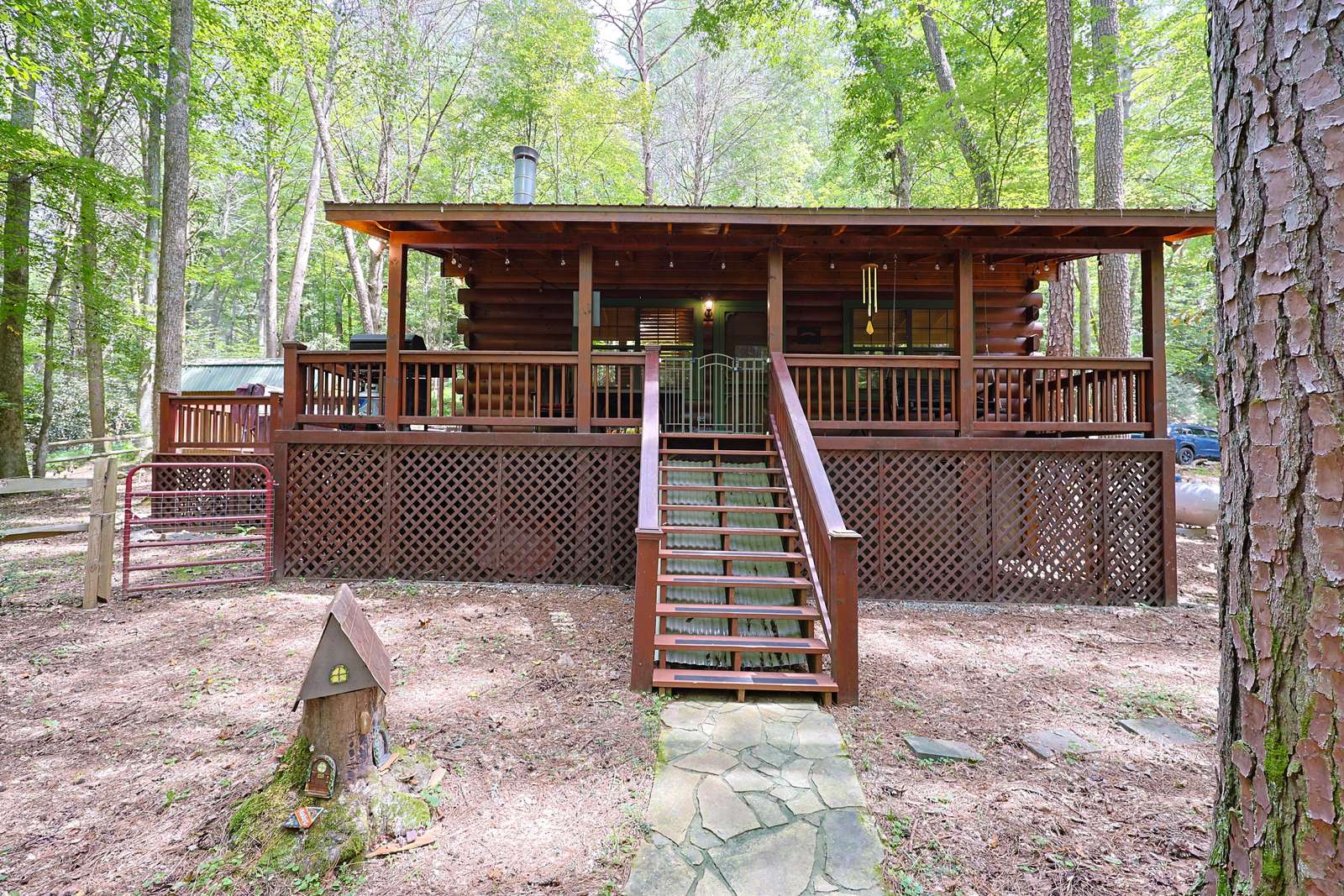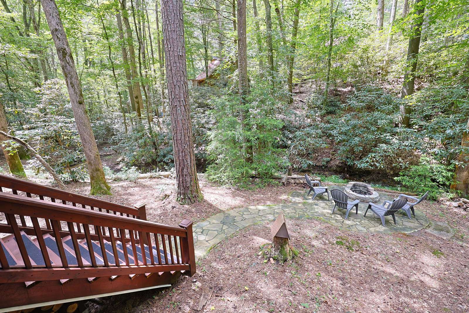 *Stairs - there are two steps leading to front door cabin. Inside cabin is all on one level. Outside decks are all on one level. There are stairs leading to backyard, firepit and creek*