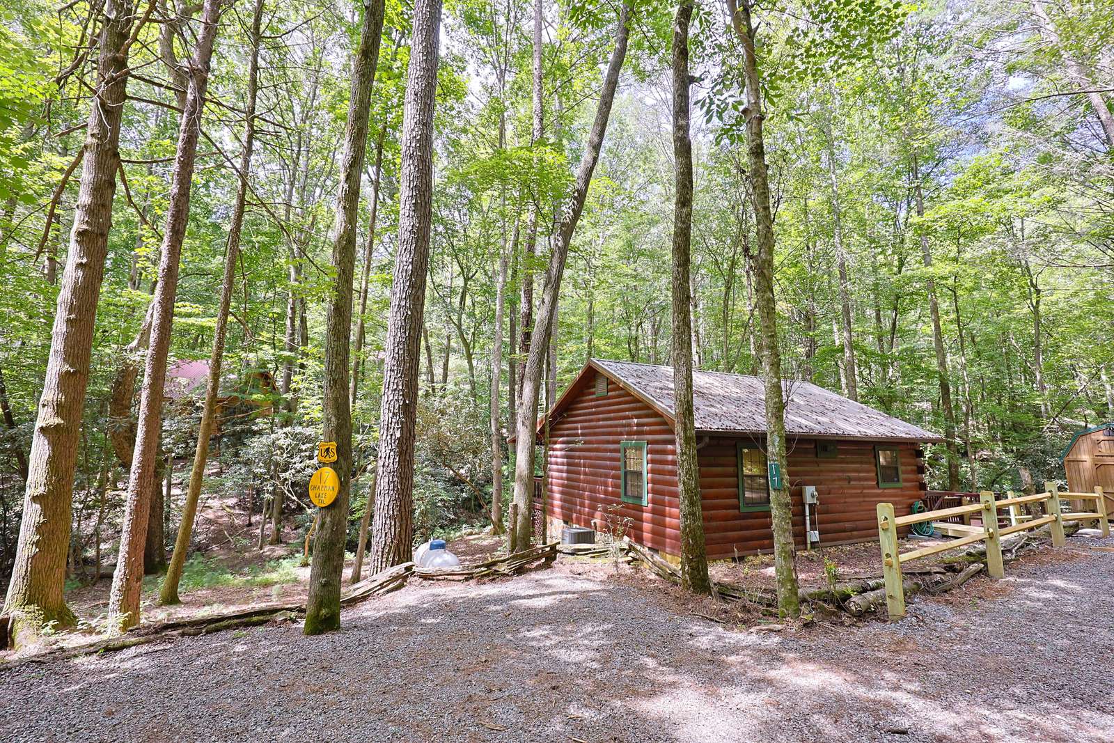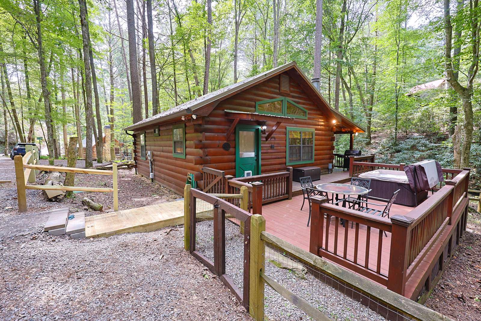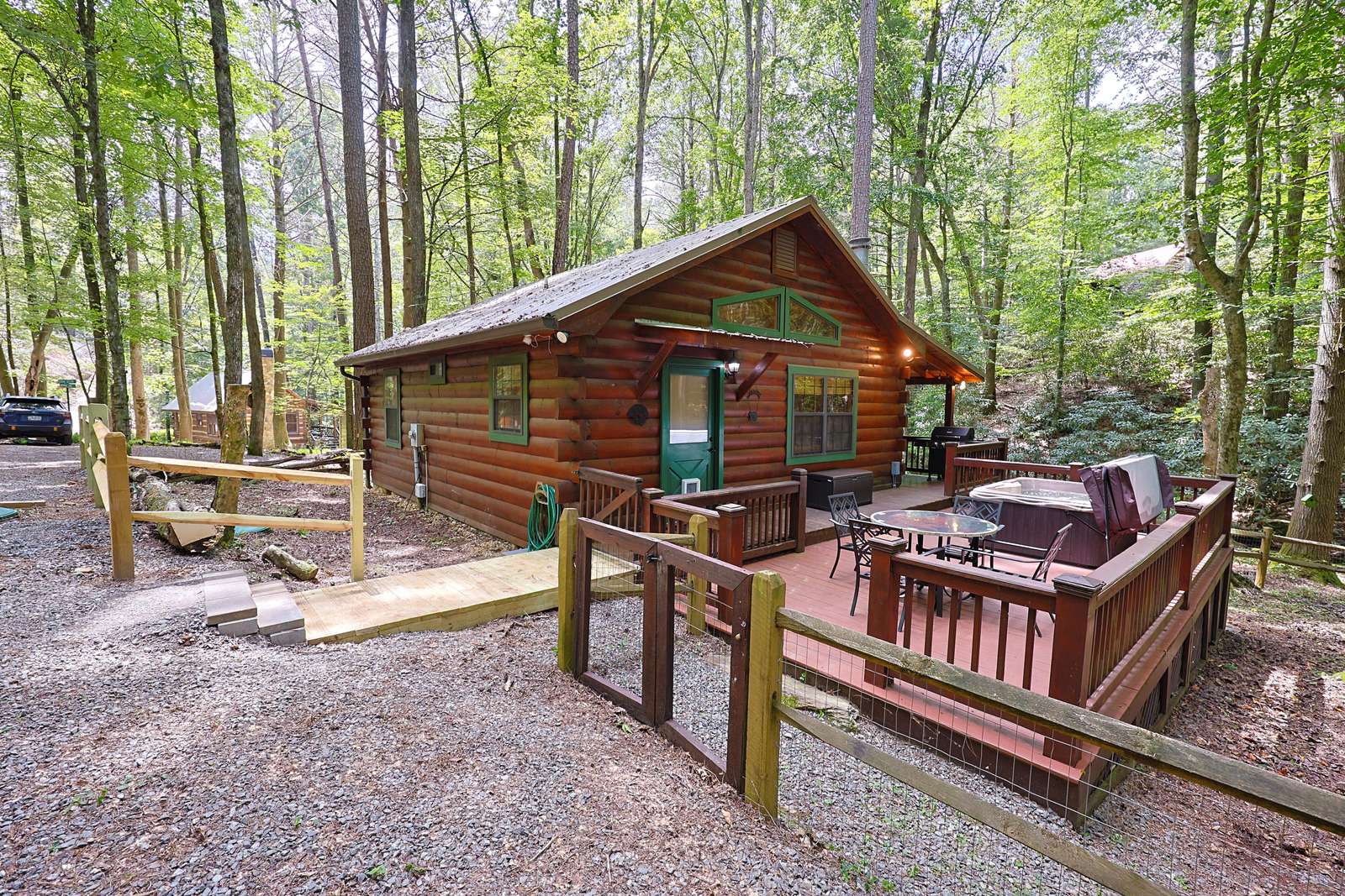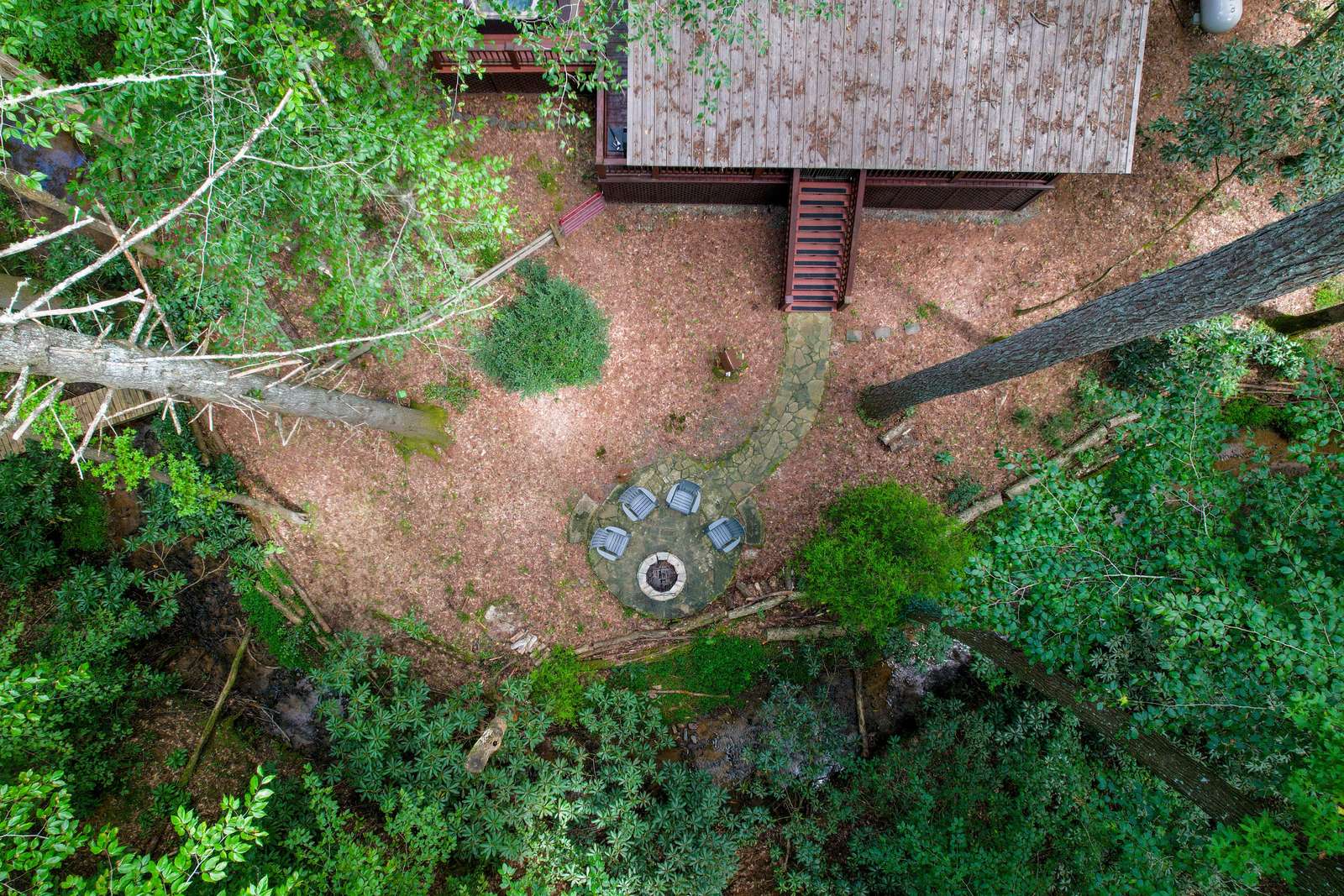 *Stairs - there are two steps leading to front door cabin. Inside cabin is all on one level. Outside decks are all on one level. There are stairs leading to backyard, firepit and creek*