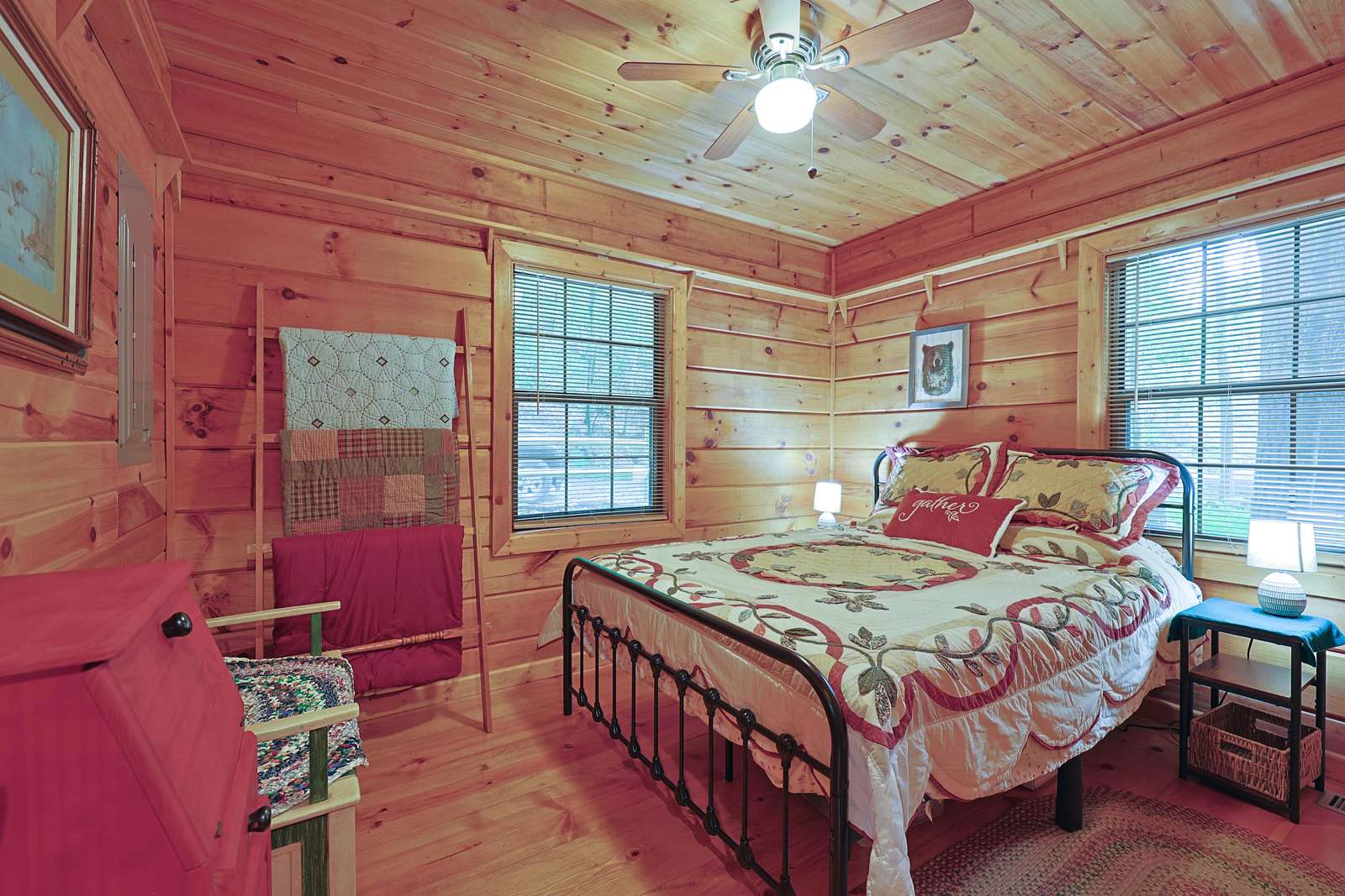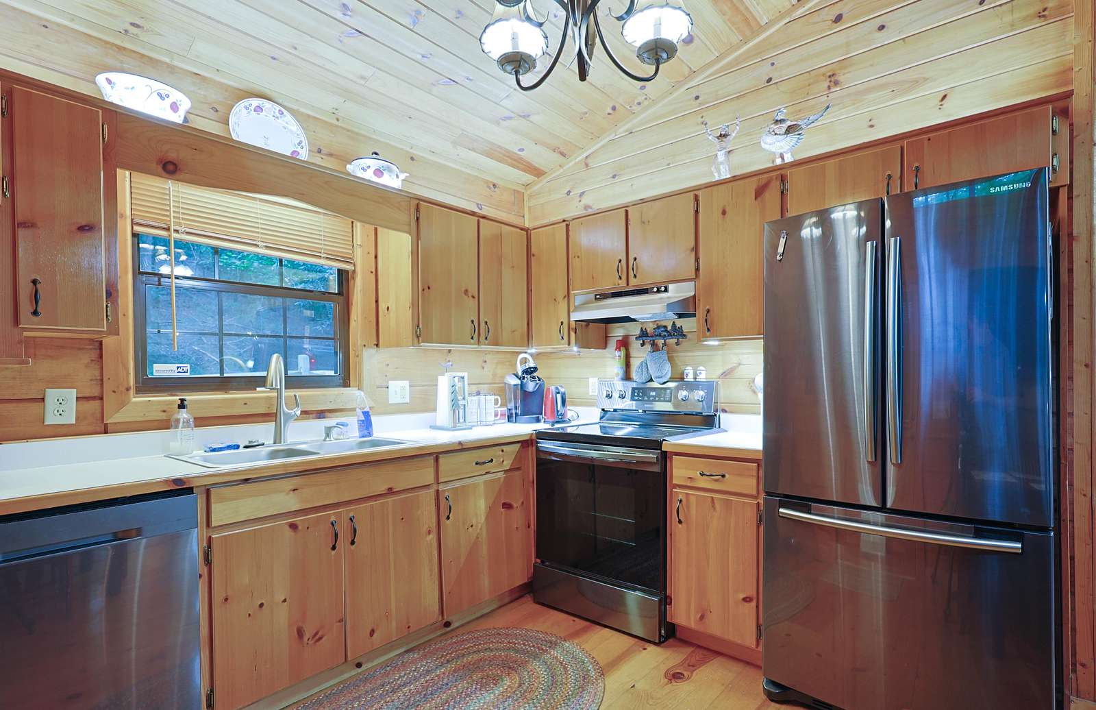 Inside, you’ll find a cozy living room with a gas log fireplace, a fully stocked kitchen featuring a brand-new stainless steel dishwasher and refrigerator, and two comfortable bedrooms with queen beds.