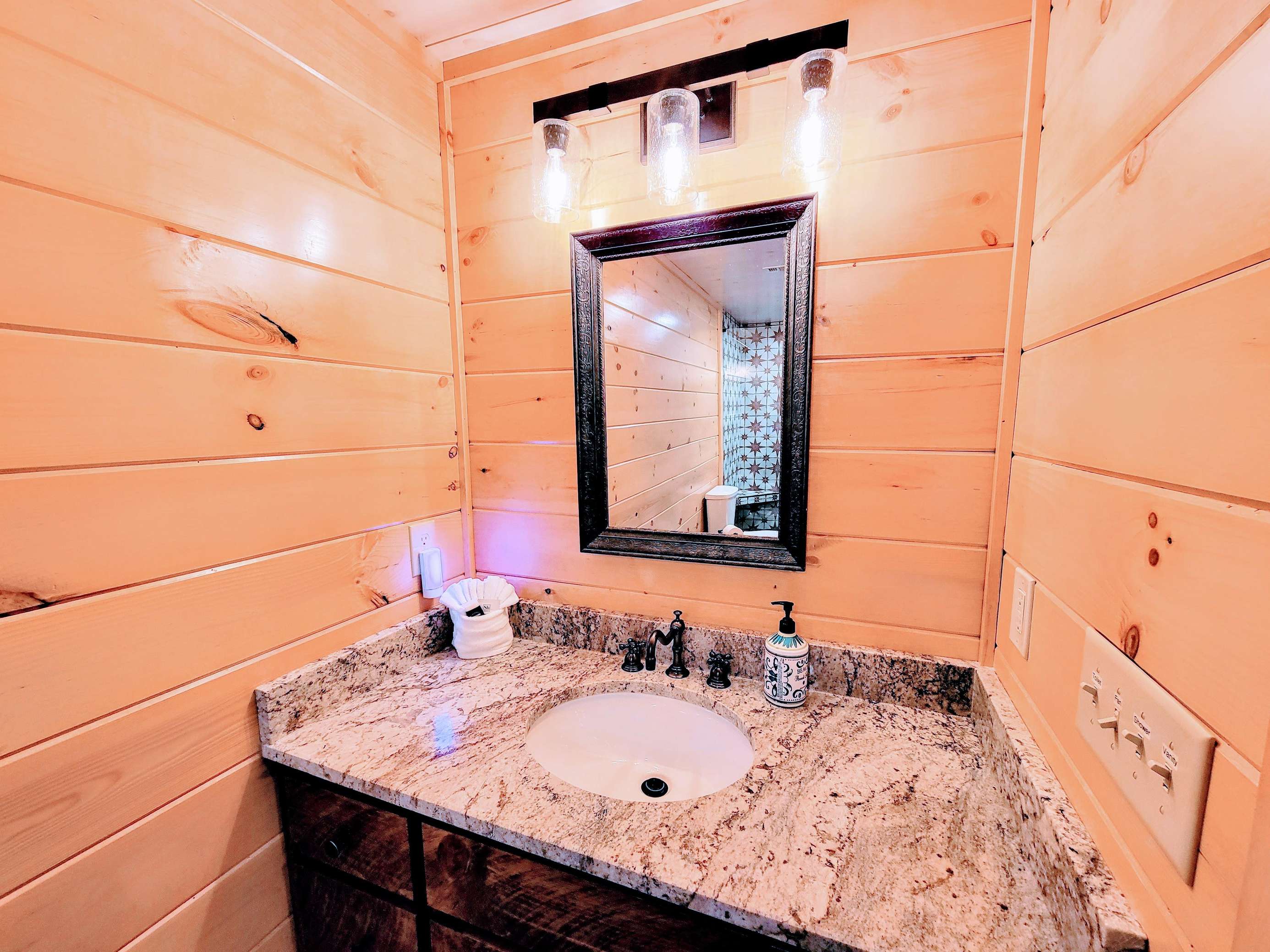 Main Level - Walking into Viewtopia (just 4 stairs into the home from parking), you will find yourself in a large great room with a wall of windows, leather furniture, HDTV, and Chromecast for streaming. This room is set up to relax and entertain, featuring an open design, dining area, gas log fireplace (available to use from October through April), and big mountain views. Just off the great room, you will find a large porch with comfy rocking chairs and a picnic table for dining outside. The kitchen also shares this large space and is equipped with beautiful granite countertops and stainless appliances. From here, there is easy access to the covered back porch and decks that afford you mind-blowing mountain views, both close range and layered long range. The daily sunrise will become appointment viewing during your stay!